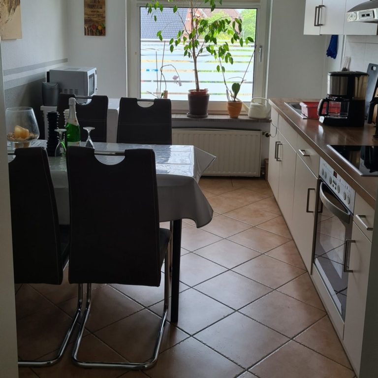 Sie ist ausgestattet mit Herd, Backofen, Mikrowelle, Kühlschrank, Senseo Kaffeemaschine, Filter Kaffeemaschine, Toaster, Wasserkocher. Wer sich also selbst versorgen will, hat in unserer Wohnung alle Möglichkeiten. Wir bekamen schon die Rückmeldung: „Die Küche ist besser ausgestattet als meine zuhause.“